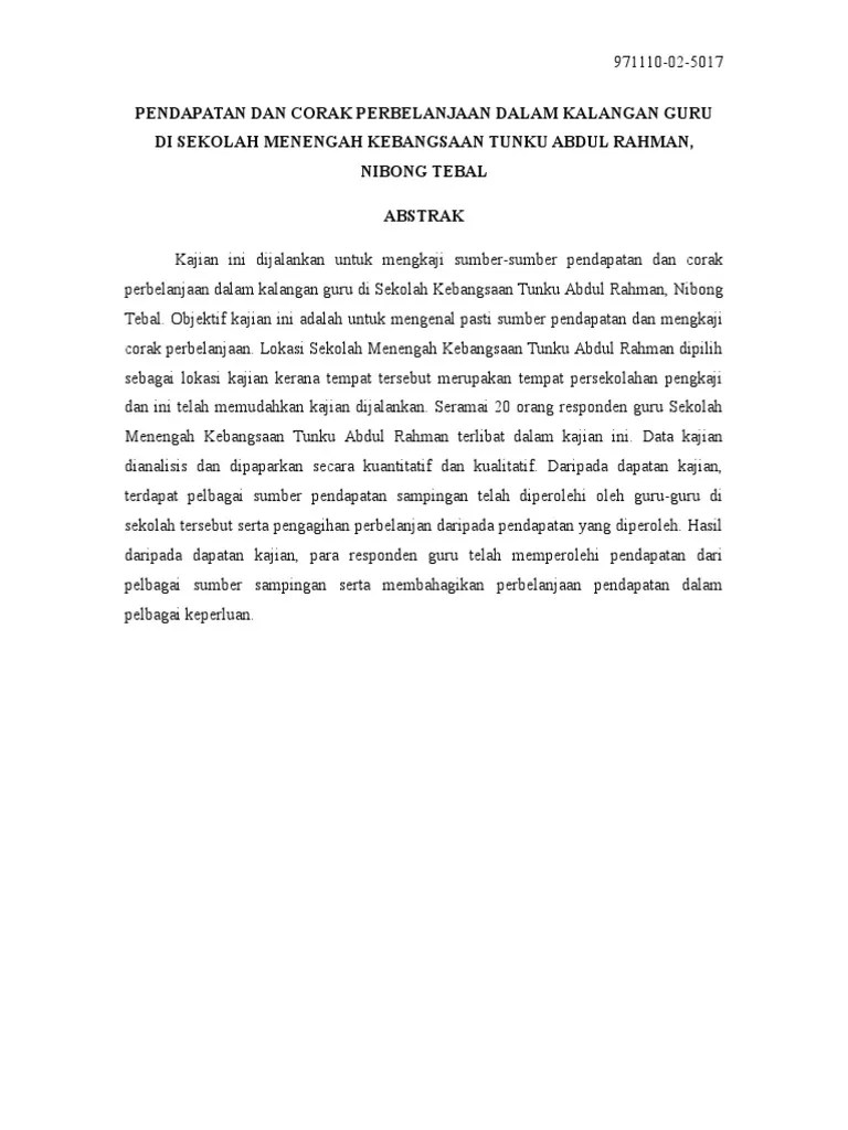 Abstrak (3 markah) boleh sehingga 150 patah perkataan menyatakan tajukkajian (di atas) , objektif kajian contoh rumusan kerja kursus. Adat resam juga perlu dikekalkan agar identity bangsa terjamin dan dijaga sepanjang masa.